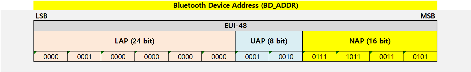 - 아래 그림의 블루투스 주소는, LAP(0xBC 0x9A 0x78), UAP(0x56), NAP(0x34 0x12)로 구성되어 있다.