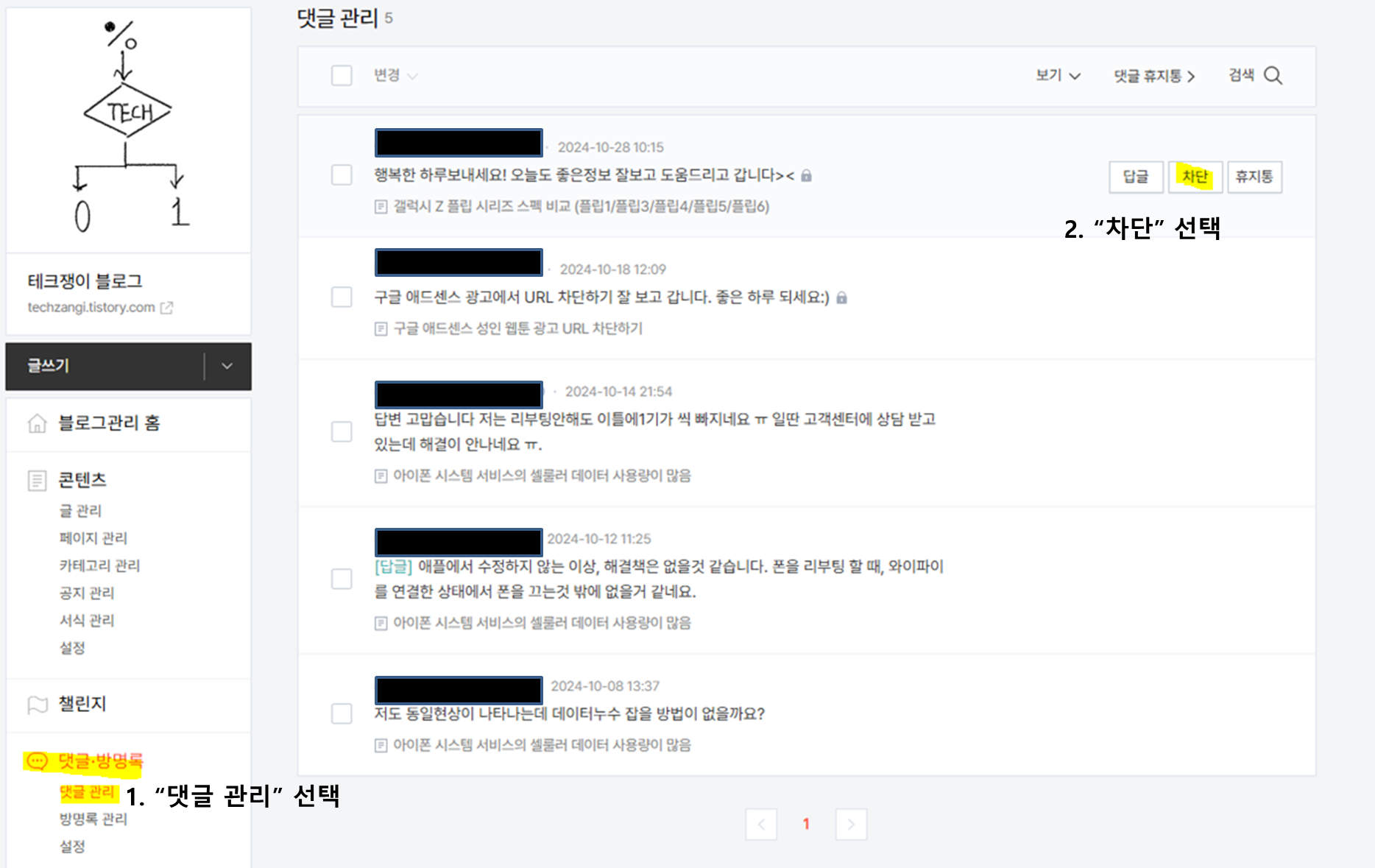 차단 방법은 아래 그림처럼, "댓글 관리" 화면에서 "차단"을 누르면 된다.