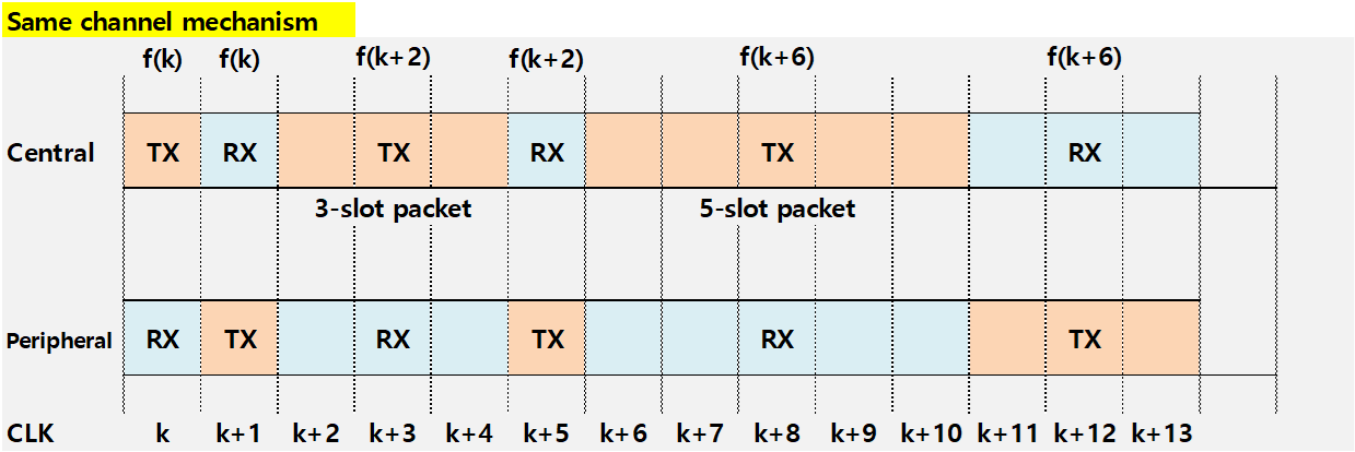 - 주파수 변경 소스: Central의 Bluetooth clock과 Bluetooth address(BD_ADDR)의 UAP/LAP를 이용