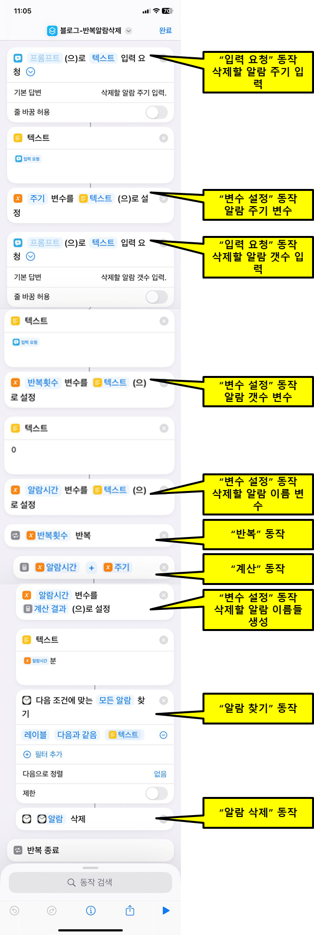 그래서 아래 단축어를 이용하면, 한 번에 생성된 알람을 삭제할 수 있다.