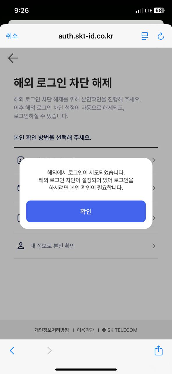 집에서 아이폰으로 SKT 로그인을 했는데, 해외 로그인 관련 팝업이 떴다.
