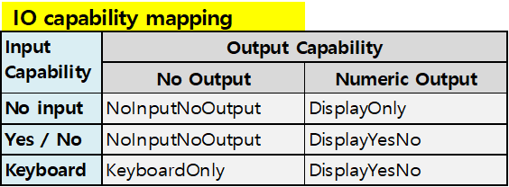 | Mapping of input/output capabilities to IO capability | 가능한 input/output은 IO capability에 맵핑되어, Authentication 알고리즘에서 사용된다.![]() |