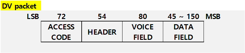 | DV | DV packet은 오직 HV1 packet을 대신해서 사용할 수 있다 Data와 Voice가 조합된 packet이다 Voice field 길이: 80 bit이고, FEC(forward Error Check)에 의해 인코딩되지 않는다 Data field 길이: 최대 150 bit 이하인 1~10 information byte(1 byte payload header를 포함)와 16 bit CRC code가 존재한다 Data field는 2/3 rate FEC(forward Error Check)에 의해 보호된다 MIC가 존재하지 않는다 Voice field는 retransmission이 없지만, Data field는 retransmission이 있다 만약 SCO 연결이 끊어지고 Data field retransmission을 해야 한다면, DM1 packet으로 retransmission을 한다 ![]() |
