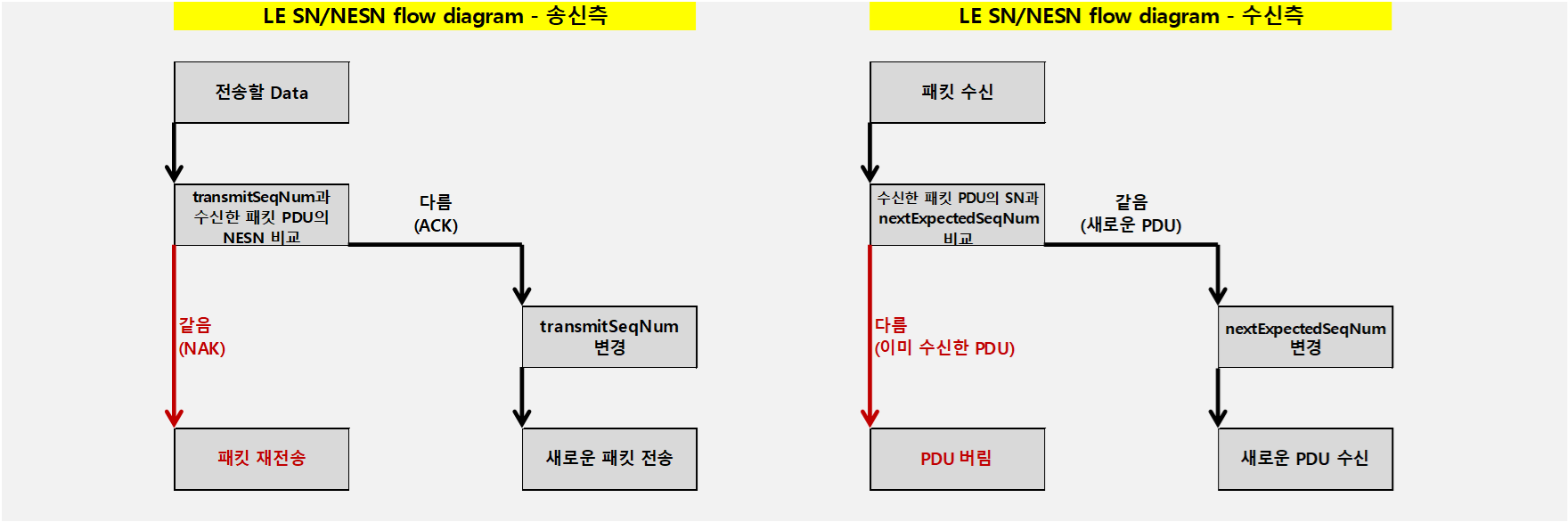 - PDU를 수신 후, 수신한 PDU의 NESN과 transmitSeqNum이 같으면 NAK이어서 재전송을 하고, 다르면 ACK이어서 transmitSeqNum은 변경되고 새로운 PDU를 전송한다