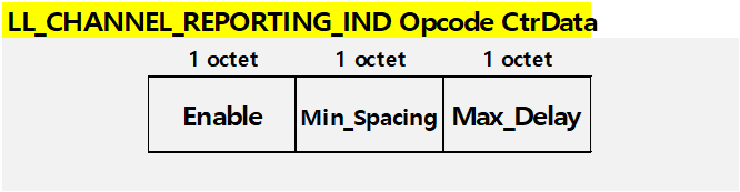 - Max_Delay: Peripheral에서 channel classification의 변화를 detect한 시점과, LL_CHANNEL_STATUS_IND PDU가 생성되는 사이의 최대 시간 (5 ~ 150 = 1s ~ 30s), (Max_Delay >= Min_Spacing)